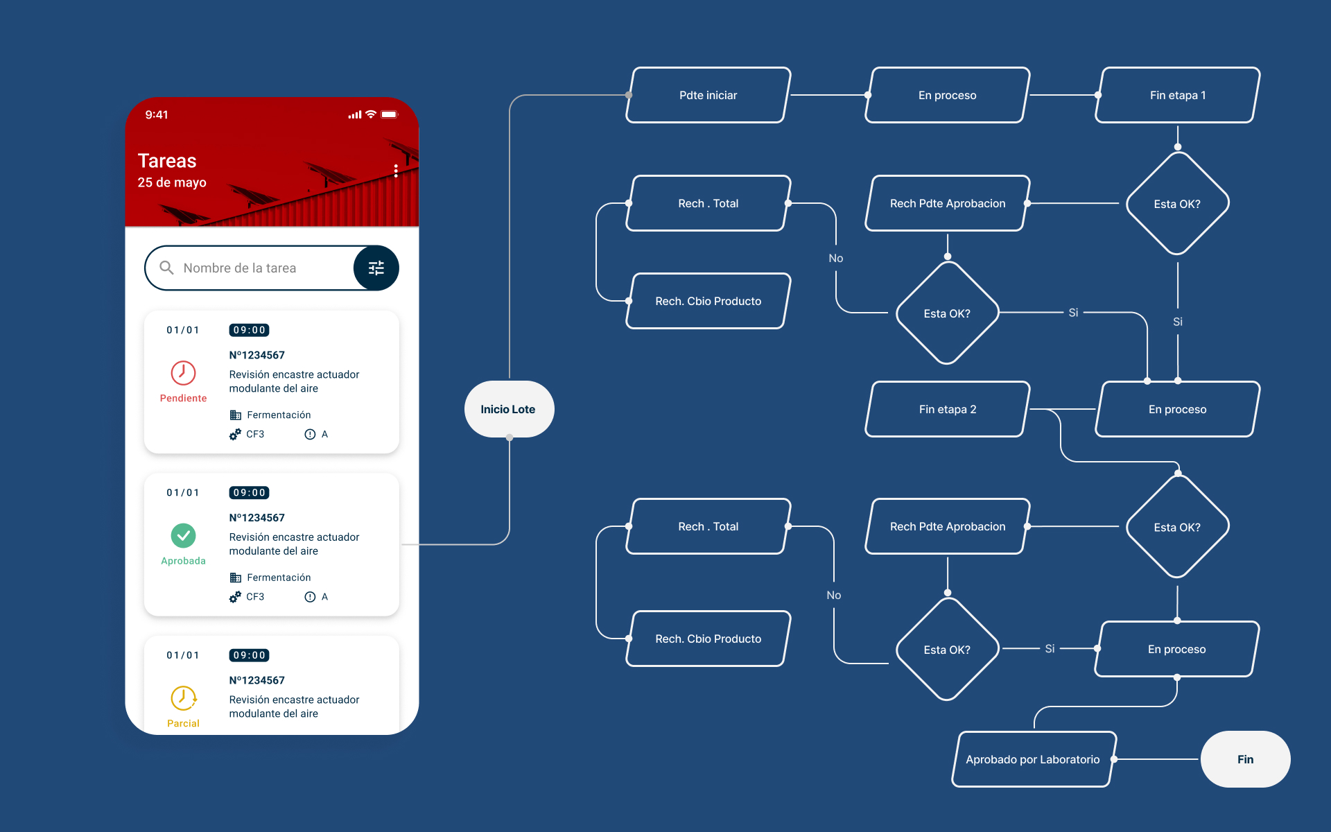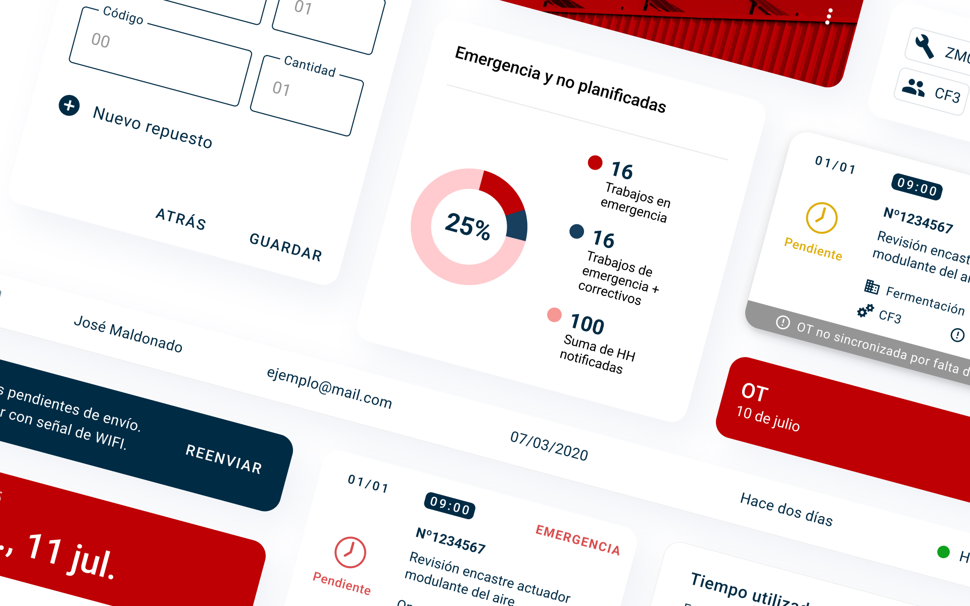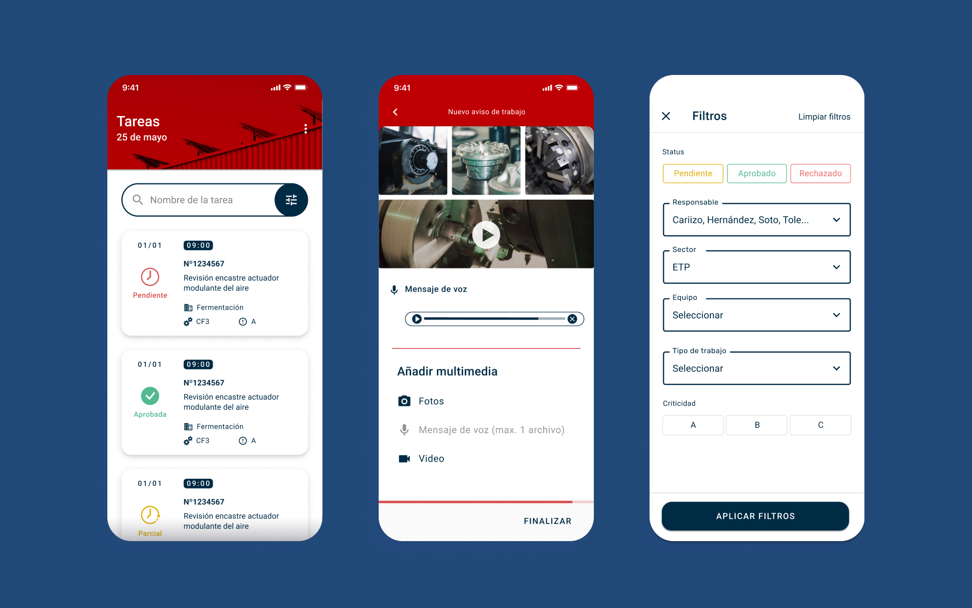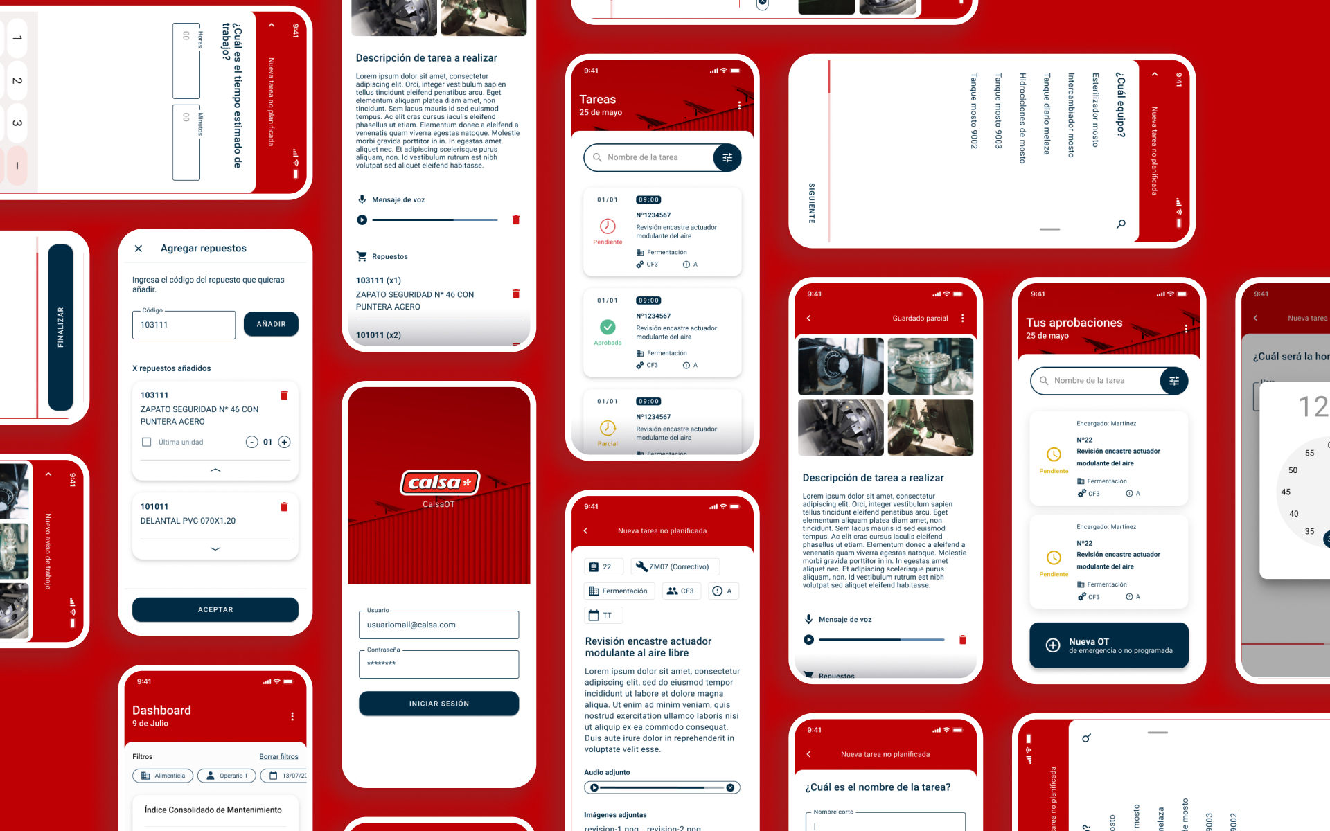 The interface uses bold red tones from the brand identity, paired with clean layouts and clear visual cues. This simple, distraction-free design keeps workers focused on key actions, making navigation fast, intuitive, and reliable on the factory floor.
