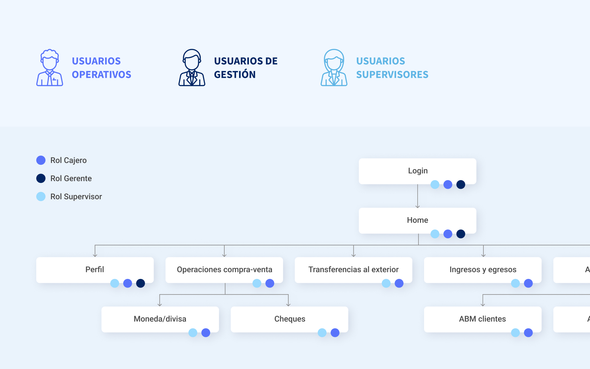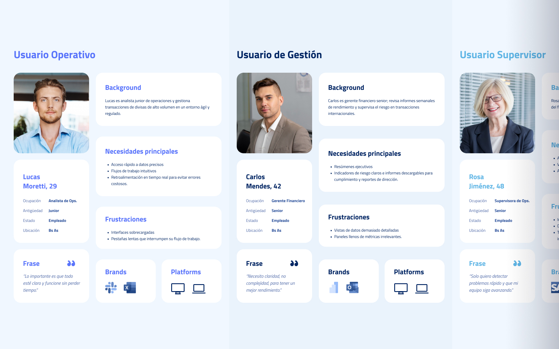We conducted user research to validate assumptions and understand real employee needs. We found that some of the client’s assumptions did not fully match user realities. We created three user personas representing different roles, Management, Supervisors, and Operative users, and defined access levels based on their responsibilities. This helped us map user journeys and identify specific pain points and workflows.